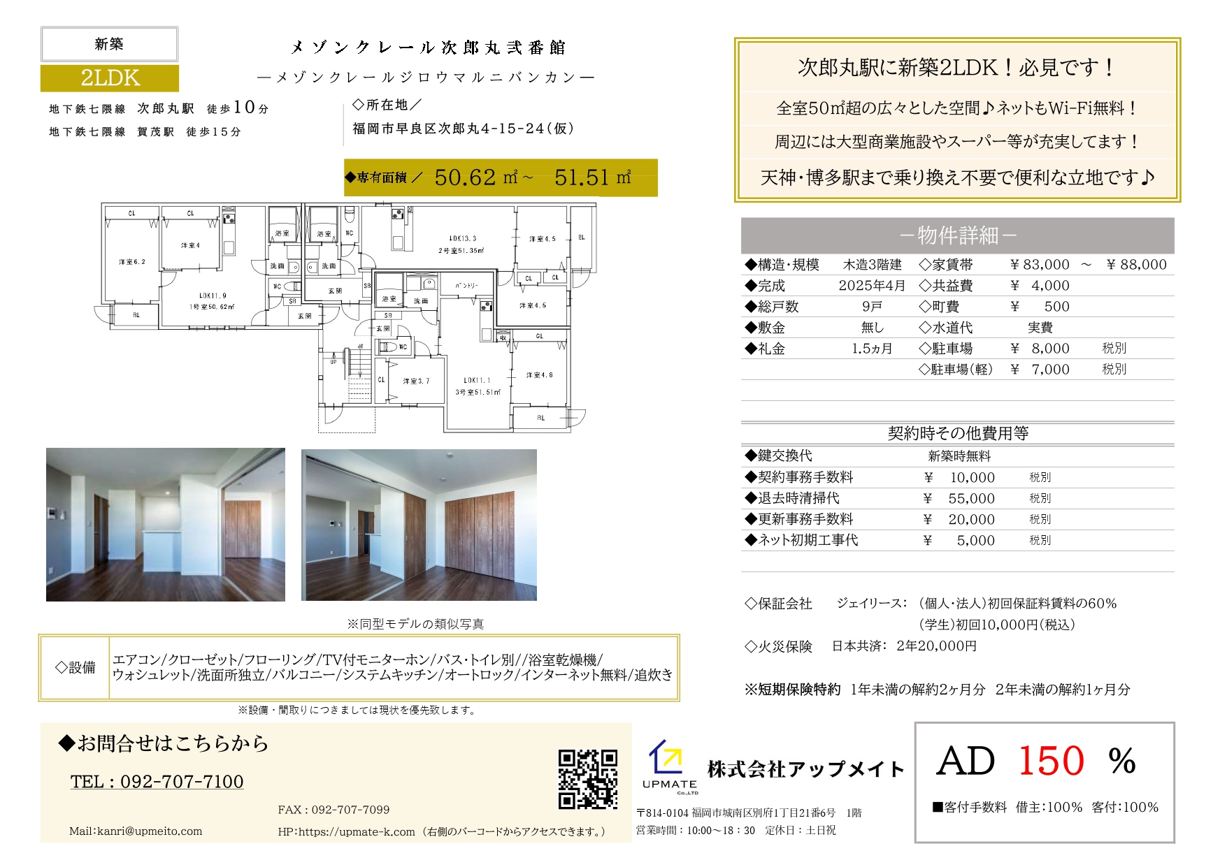次郎丸駅に新築2LDK!必見です!全室50㎡超の広々とした空間♪ネットもWi-Fi無料!
